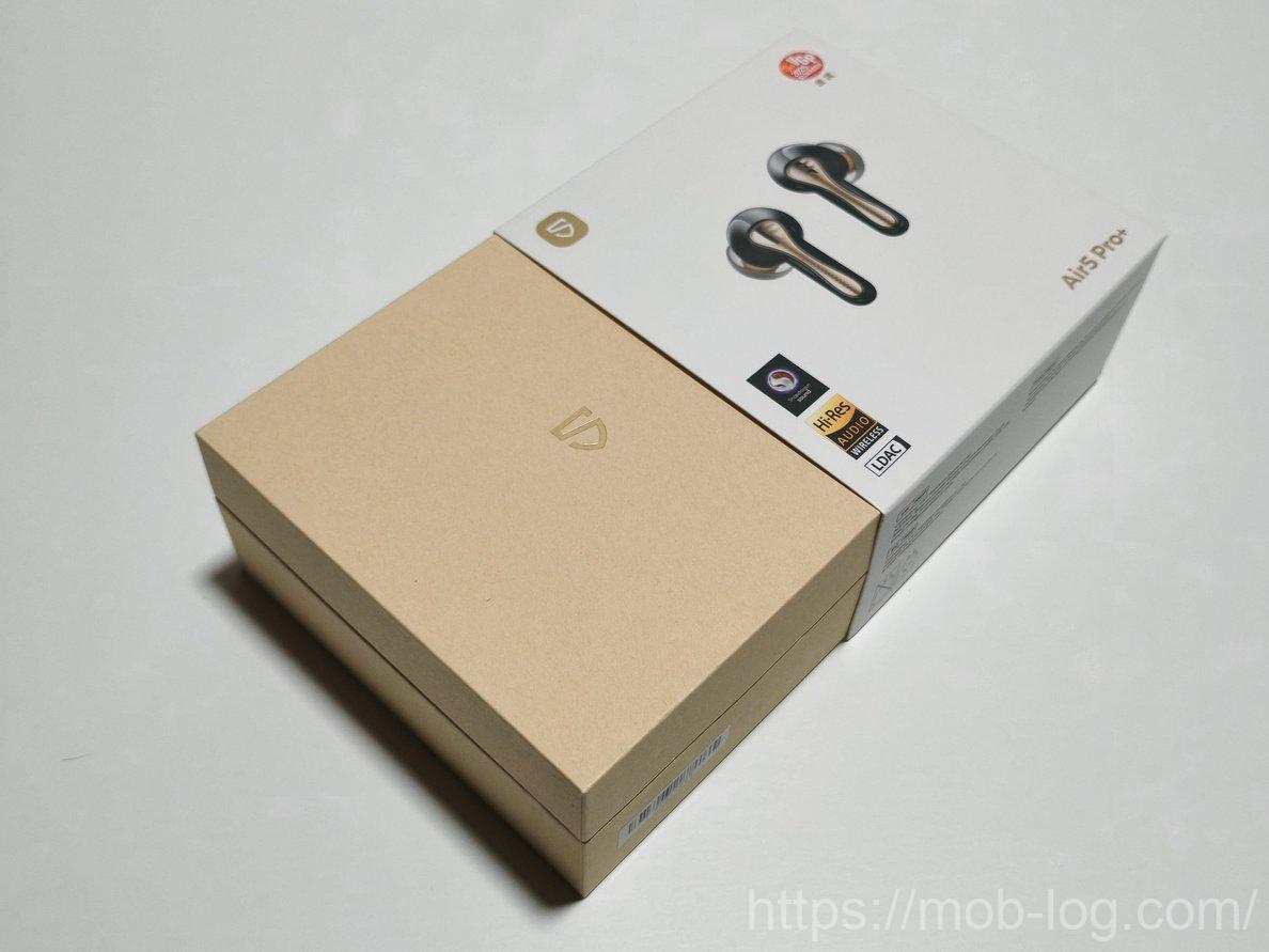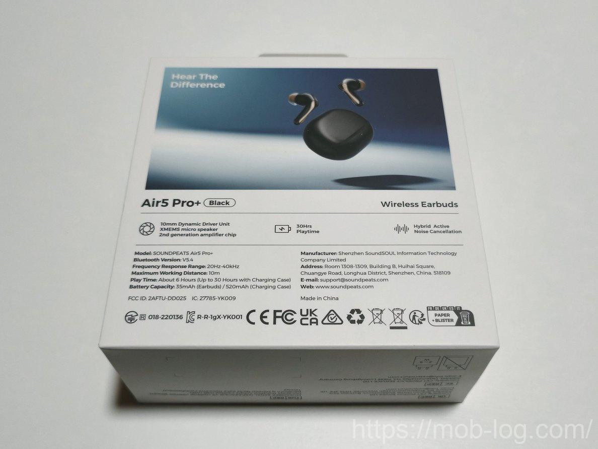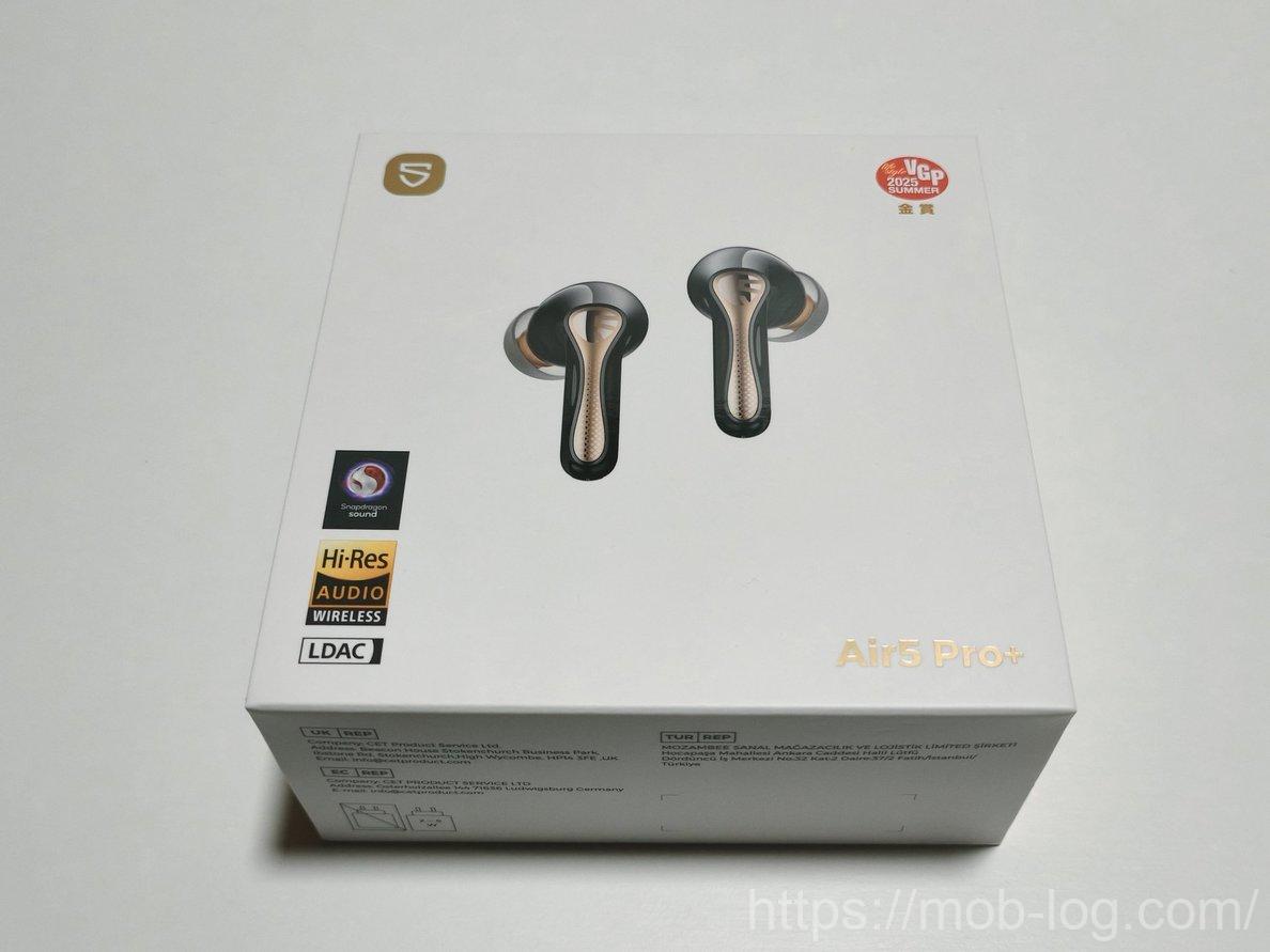 真っ白な箱にAir 5 Pro+の写真がプリントされたシンプルなデザイン。
