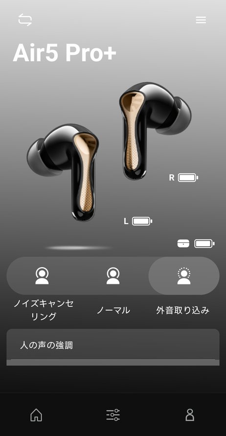 実際に使ってみてもその違いは明らかで、静かな自室で一般的なANCイヤホンのノイキャンをオンにすると「サーッ」というホワイトノイズのようなものが聴こえましたが、Air5 Pro+の場合は完全に聴こえなくなるわけではありませんが、ノイズが非常に小さくなっているのがわかりました。